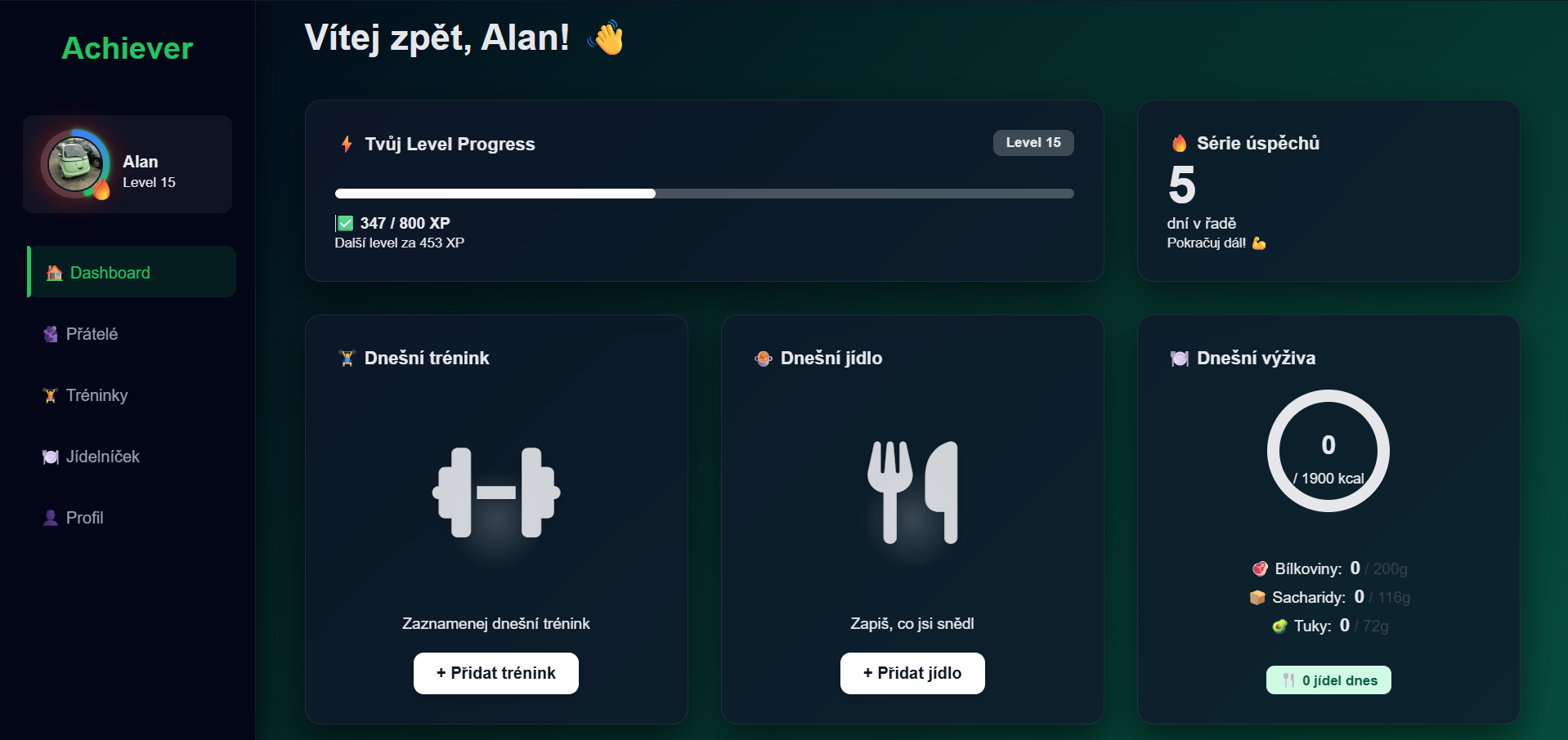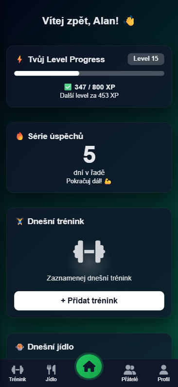 Tady máš veškerý přehled o levelu, streaku a taky vidíš, jak se ti během dne dařilo.