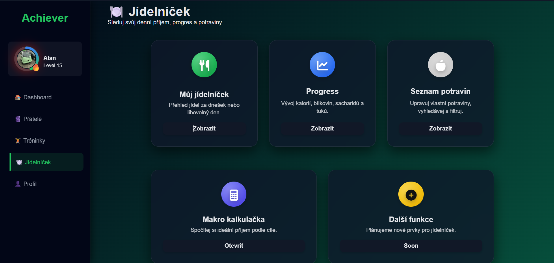 Tady je přehledný "dashboard" pro jídelníček, nech si spočítat ideální přijem podle cíle a pak můžeš jednoduše přidávat jídla hlasem.