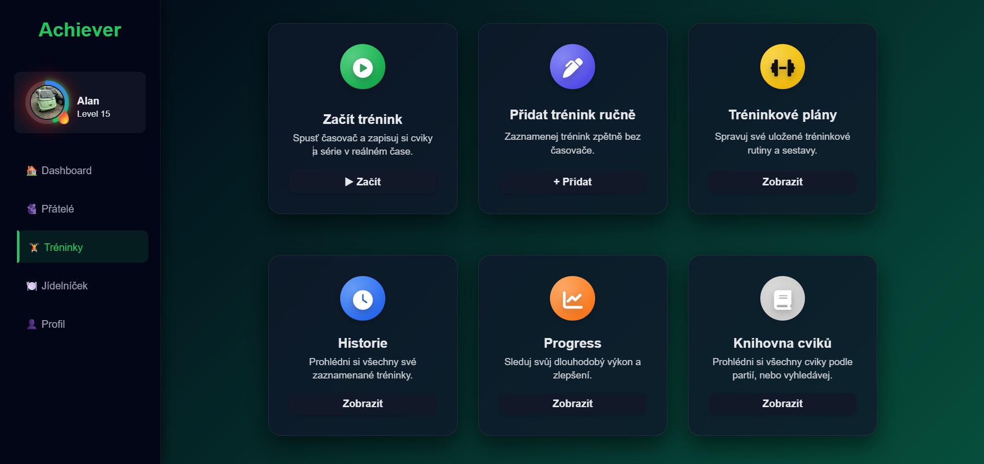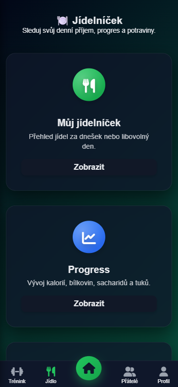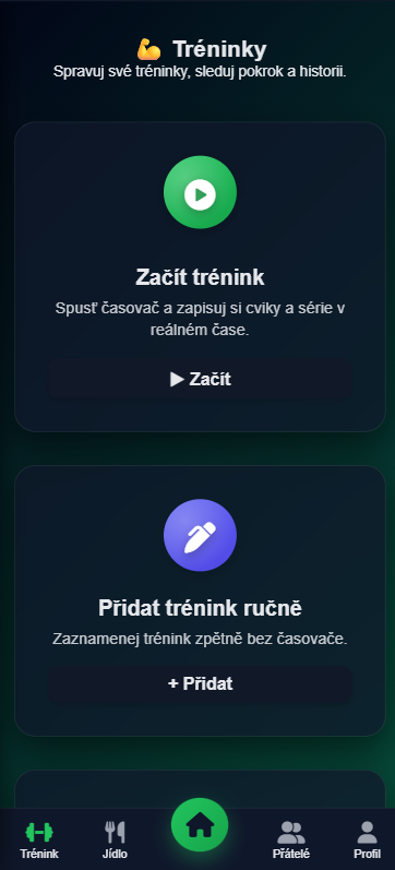 Další přehledný "dashboard". Můžeš začít živý trénink, zpětně ho zapsat, sledovat progress a naplánovat si další tréninky.